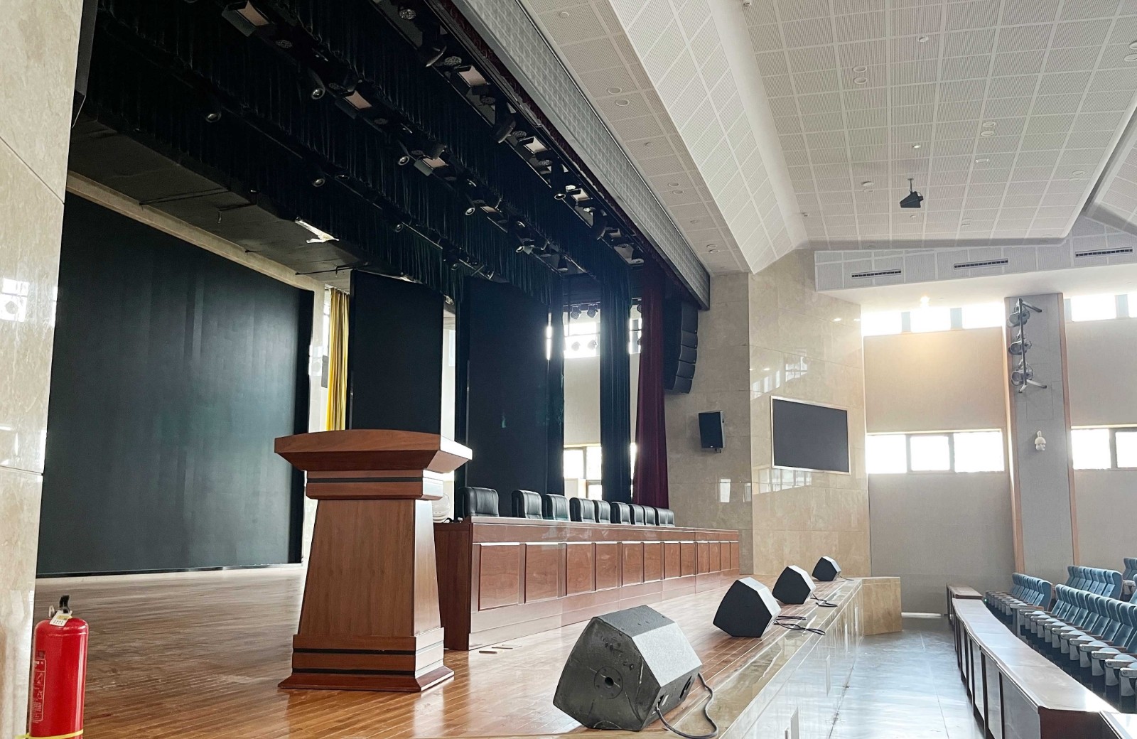 針對園區面積較大,實時廣播通知、各區域業務分區廣播、應急消防報警、尋呼可視對講,這些功能作為基礎功能,滿足園區日常廣播需求。報告廳共設計多功能音箱、吸頂音箱、主擴聲音箱,臺唇音箱。返聽音箱,低音音箱,輔助音箱,形成良好的聲場均勻度,滿足發言,匯報,舞臺的功能使用。