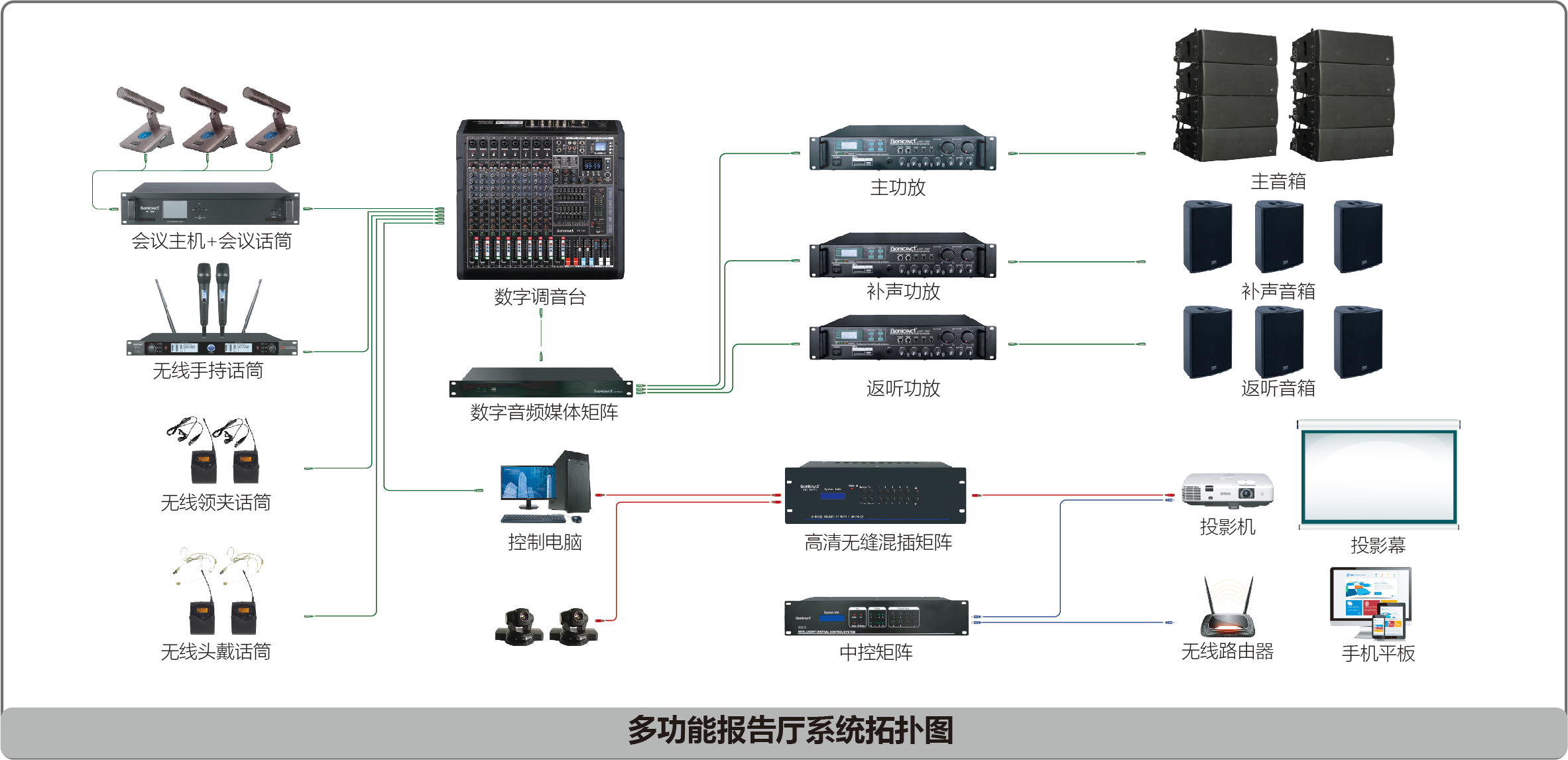 擴聲系統是一項系統工程,涉及電子技術、電聲技術、建聲技術和聲學藝術等多種學科,同時還須與視頻系統(多媒體投影和攝像系統)、燈光系統、消防廣播系統、尋呼廣播系統和安保系統等子系統的密切配合和協調。擴聲系統的音響效果不僅與電聲系統的綜合性能有關,還與聲音的傳播環境——建筑聲學和現場調音使用密切相關。擴聲系統的使用功能和音響效果涉及正確合理的電聲系統設計和調試、良好的聲音傳播條件和正確的現場調音技術三者最佳的配合。